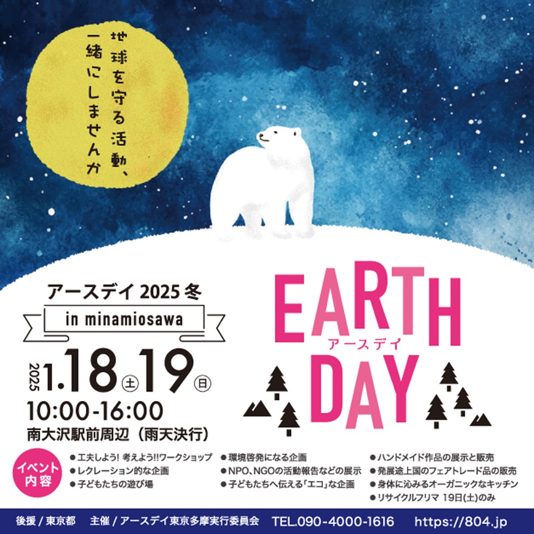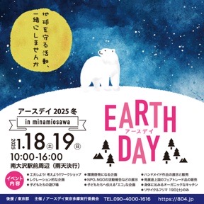 - ~南大沢~アースデイ2025~冬~ in 南大沢 2025年01月18日・19日、南大沢駅前周辺にて「アースデイ2025~冬~ in 南大沢」開催。 ・・・出店のご予約・ご相談受付中!